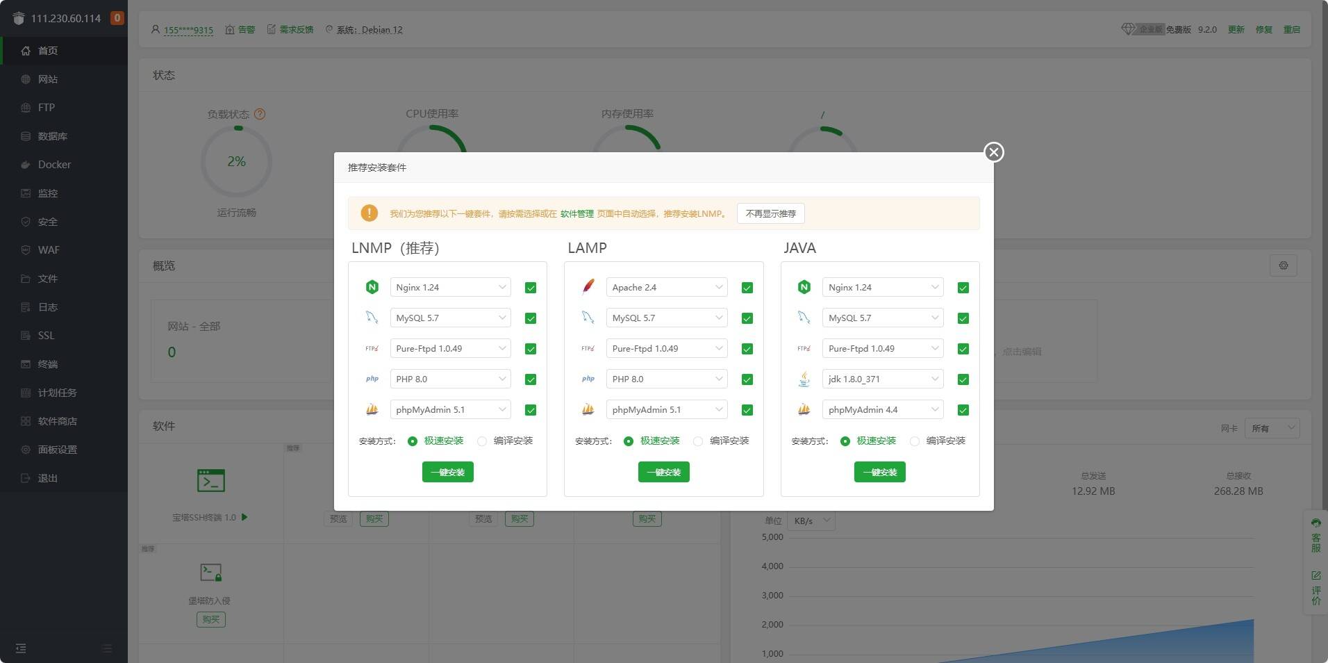 - 进入面板后,将会提示您安装基础环境,推荐选择