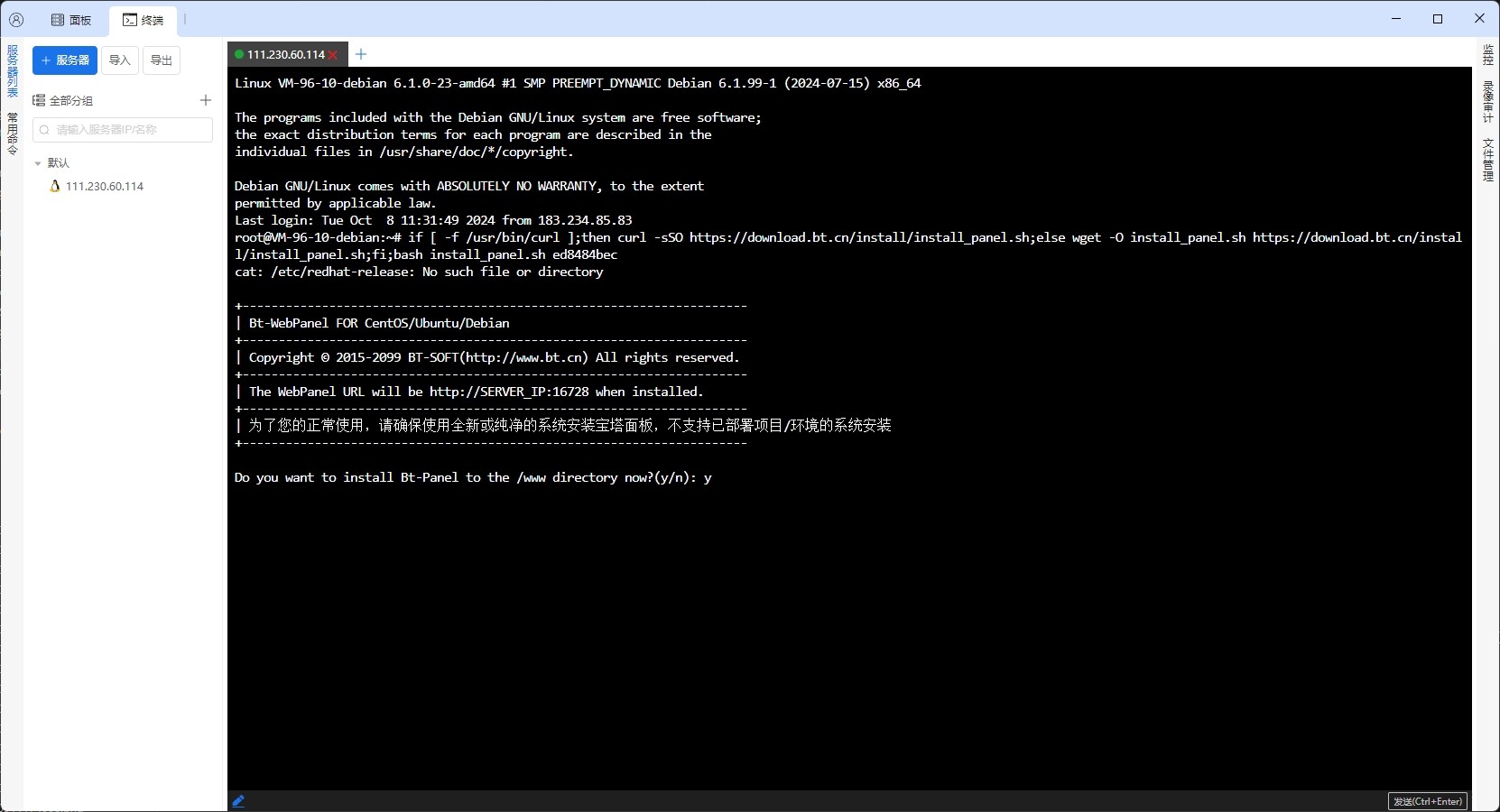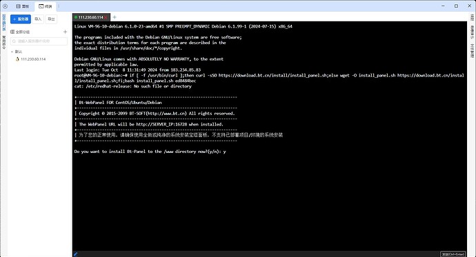 Do you want to install Bt-Panel to the /www directory now?(y/n). Enteryand press Enter to confirm, then wait for the panel to install automatically. -